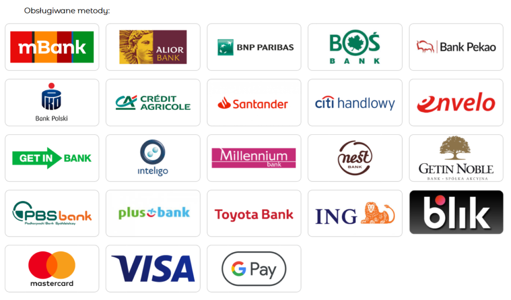 - Płatność przy użyciu karty płatniczej – karty płatnicze: VISA, VISA Electron, MasterCard, Maestro.